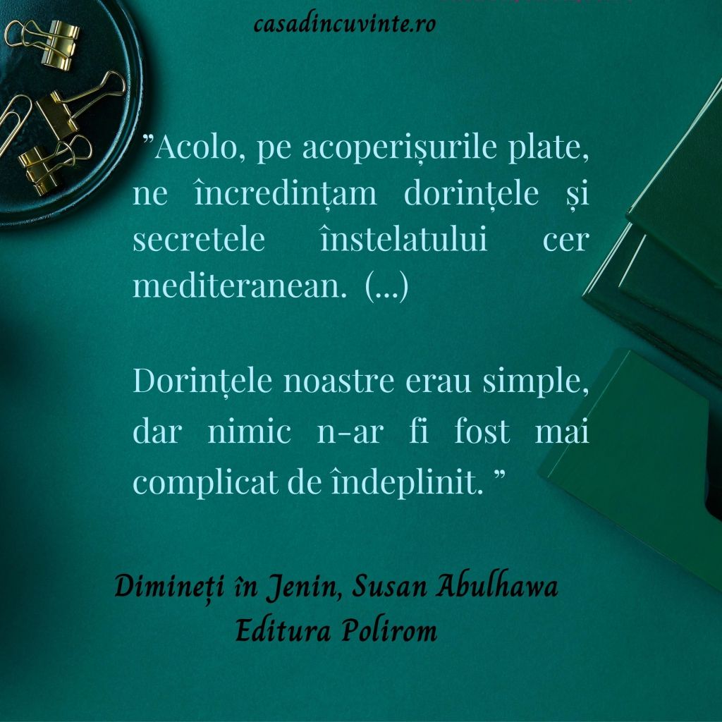 ”Dimineți în Jenin” este o carte dură, cu un impact emoțional puternic. Povestea șocantă și controversată mi-a creat o stare de confuzie care a continuat câteva zile bune după terminarea lecturii.