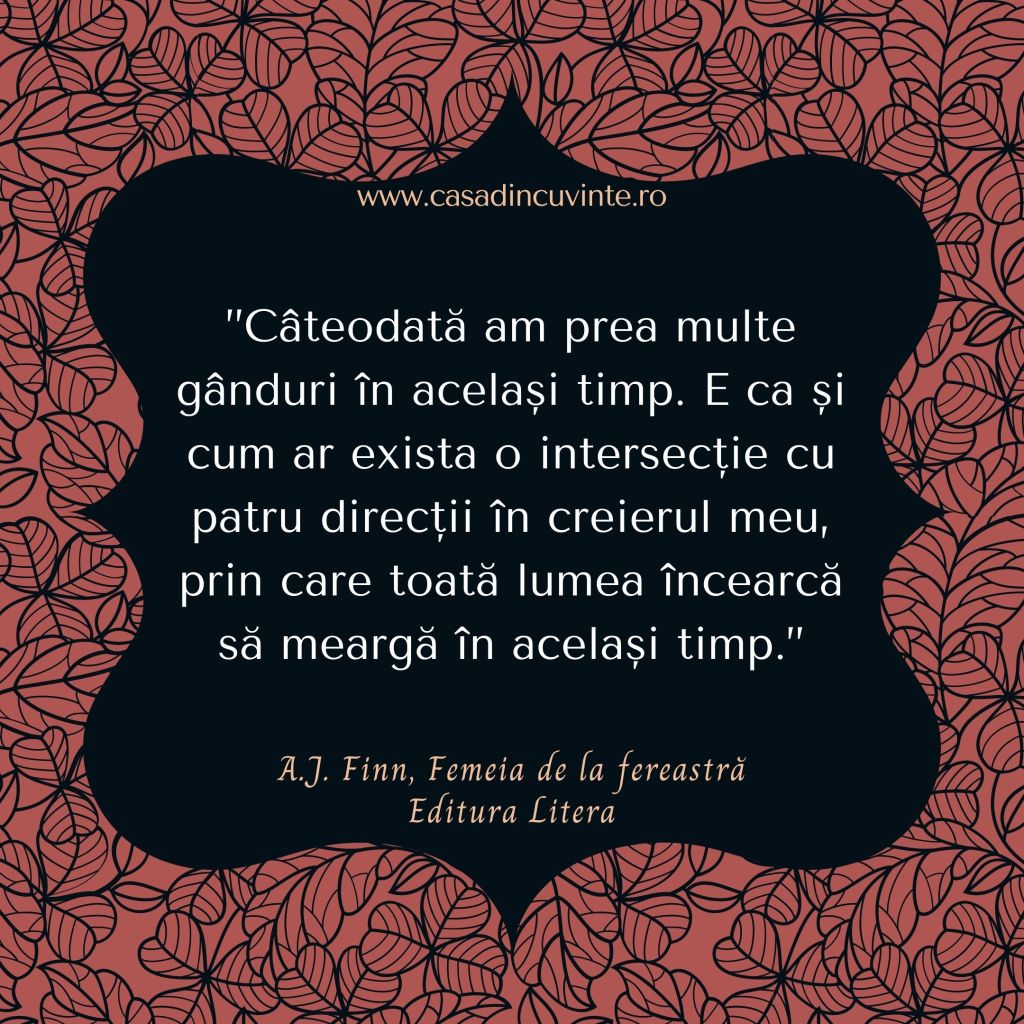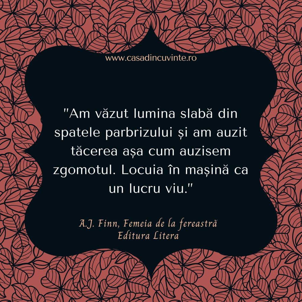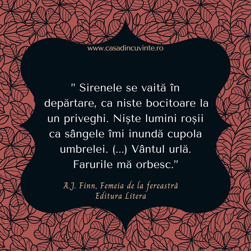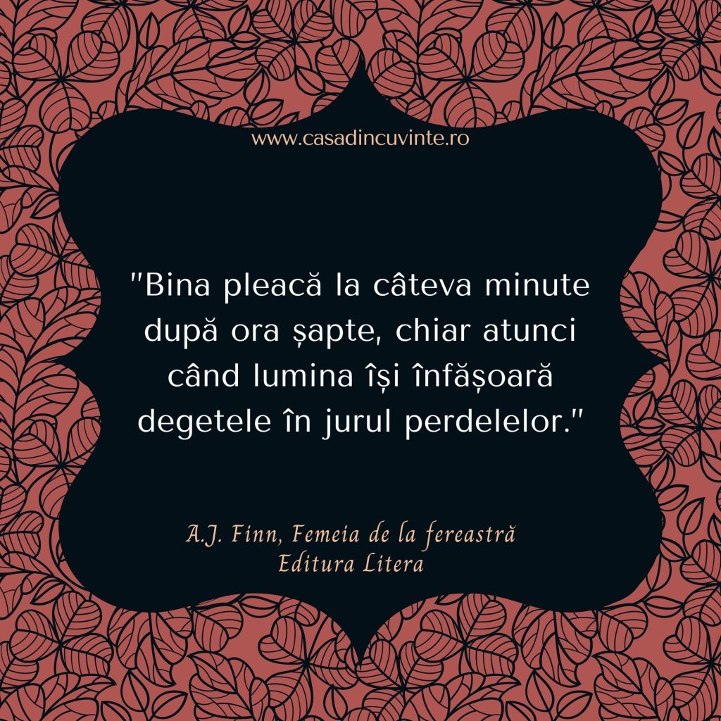 Dar într-o seară, un țipăt teribil rupe tăcerea, iar Anna este martora a ceva ce nimeni nu trebuia să vadă. Acum trebuie să facă tot ce poate pentru a descoperi adevărul despre ceea ce s-a întâmplat în realitate. Dar chiar dacă îl va afla, o va crede cineva? Și poate să aibă încredere în ea însăși?” – prezentarea editurii